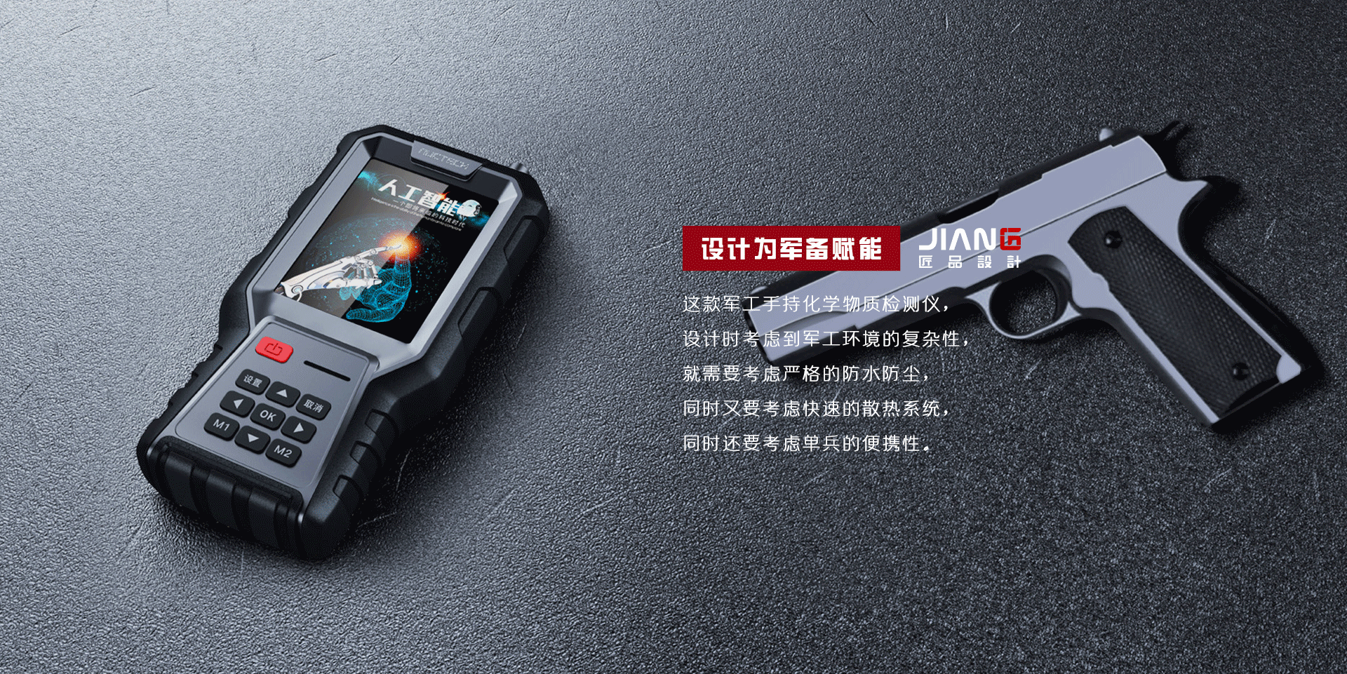 匠品設(shè)計--這款軍工手持化學(xué)物質(zhì)檢測儀,設(shè)計時考慮到軍工環(huán)境的復(fù)雜性,就需要考慮嚴(yán)格的防水防塵,同時又要考慮快速的散熱系統(tǒng),同時還要考慮單兵的便攜性。